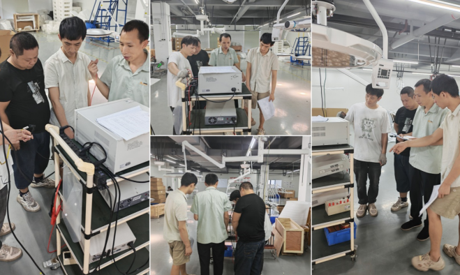 In the operating room light production workshop of Hunan Mplent Optoelectronics Technology Co., Ltd., a skills training session is underway. Experienced technical engineer Jiang, systematically explains and demonstrates the correct operation methods of various safety regulations testing instruments to the front-line employees.