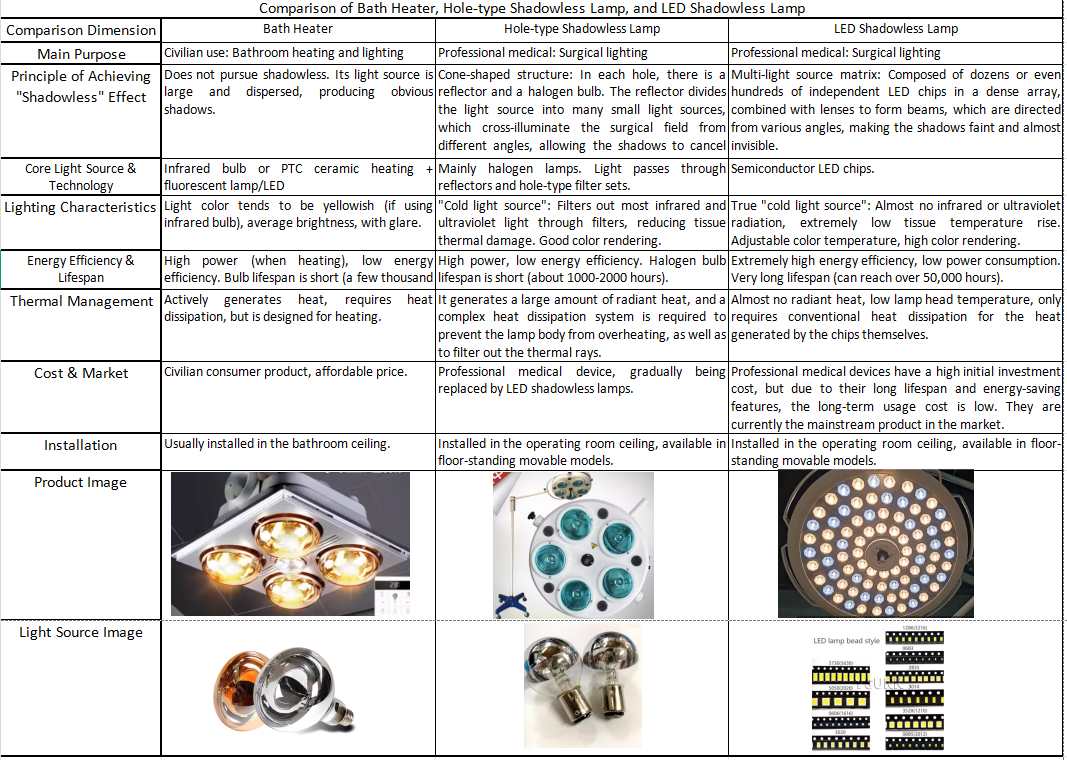 Next, let's compare bath heaters, hole-type shadowless lamps, and LED shadowless lamps from several dimensions: